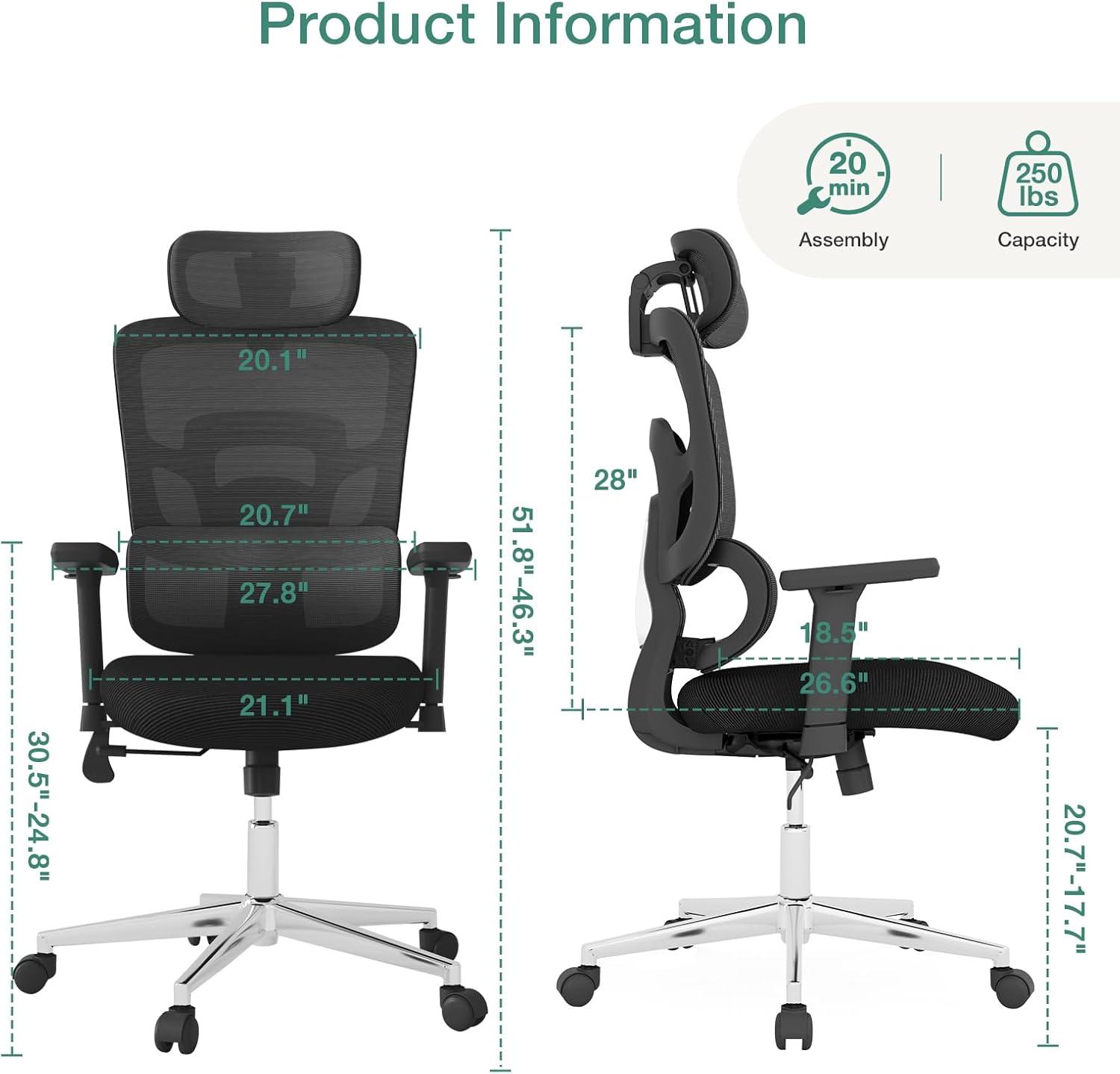 Wide Mesh Office Chair with Thickened Cushion: Our ergonomic office chairs can accommodate individuals weighing up to 250 lbs, featuring an expansive and accommodating design tailored for diverse body shapes, making it an excellent choice for taller individuals. The premium sponge material effectively alleviates pressure on the hips and tailbone, ensuring lasting comfort during extended periods of sitting.