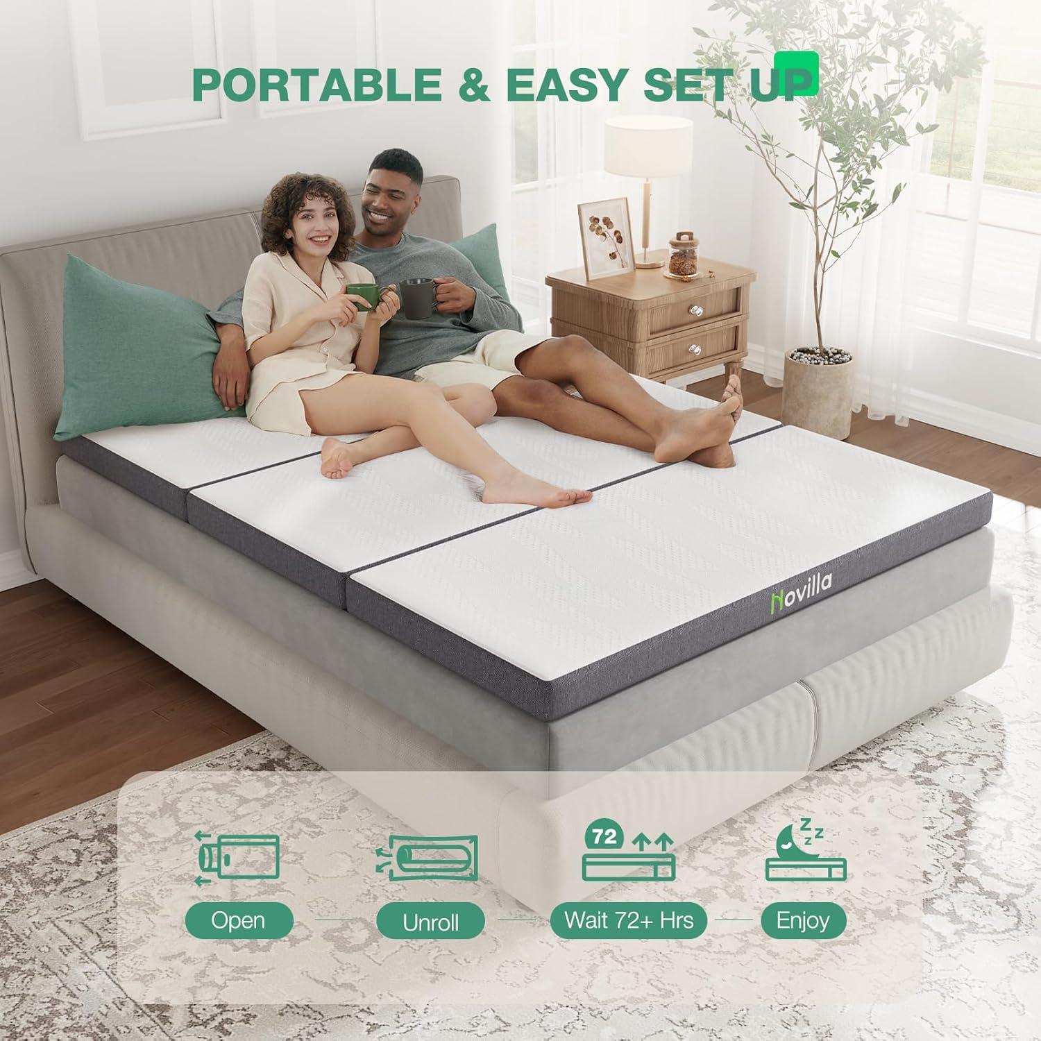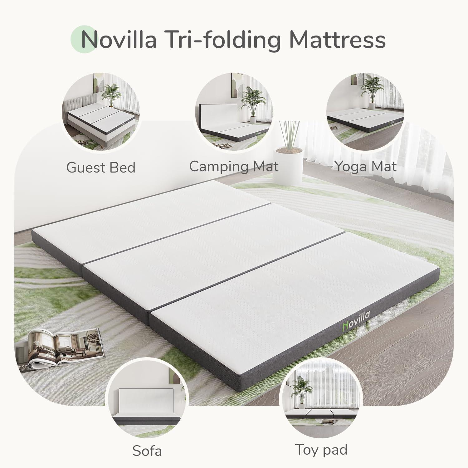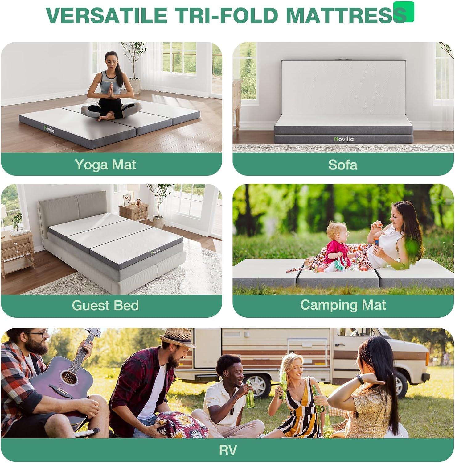 PORTABLE MATTRESS FOR MULTIPURPOSE- Novilla tri folding mattress is applicable to a variety of situations, it can be folded into a sofa, deck chair and stool, also used as guest bed on the floor for a comfortable night's sleep. This portable mattress is easy to storage and carry, it can be reduced to a compact size, allowing you to move this mattress anywhere, provide you a temporary sleeping during your traveling, partying, RV, camping.