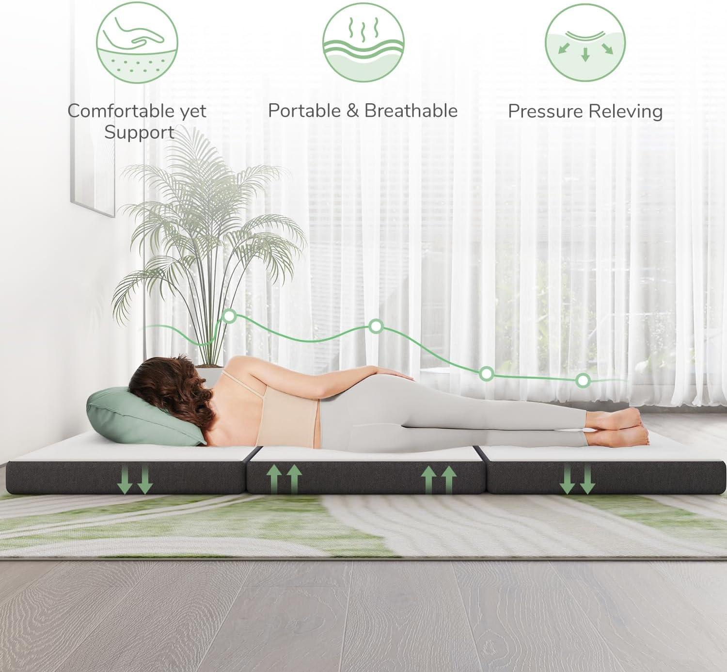 COMFORT IN MORE THAN ONE PLACE and ONE WAY- This portable single trifold mattress supports every contour of your body to help with pressure relief. You'll enjoy a peacefull rest and refresh yourself anywhere. Besides being a foldable floor mattress, it's multifunctional and can be folded into a sofa, cushion, or foldable mattress topper as needed.