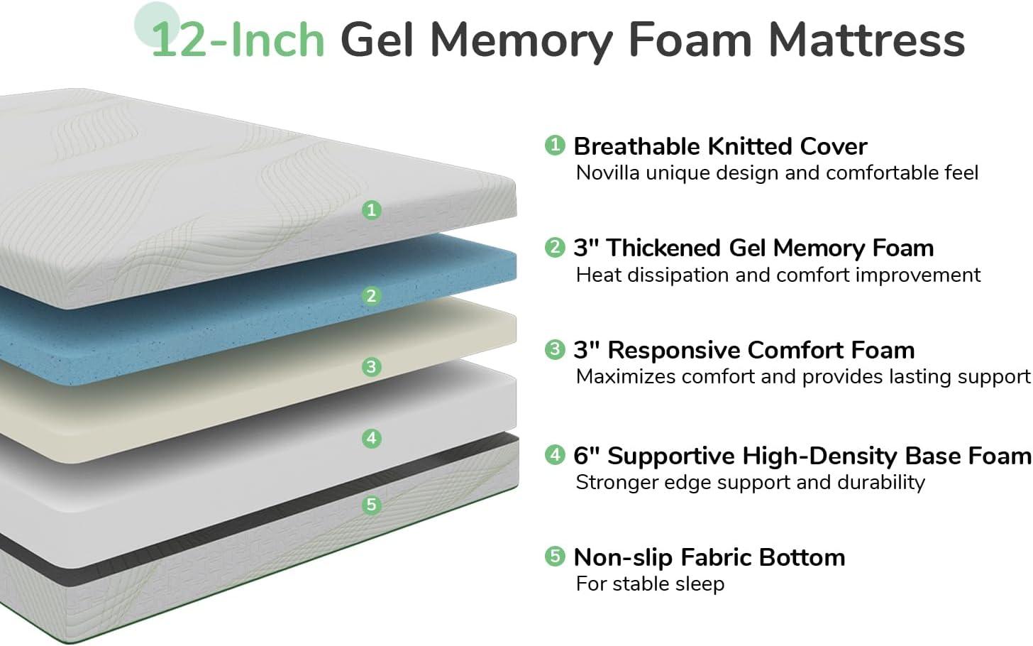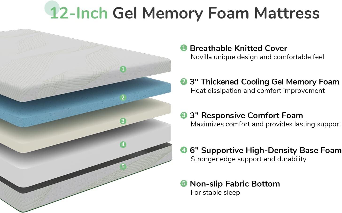 This Novilla 12 inch gel memory foam mattress is a medium firm mattress covered with a soft and breathable fabric. The memory foam mattress suits back/side/stomach sleepers since it can automatically adjust according to the spine curves of the human body and effectively relieve pressure. Besides, the gel foam mattress can lower the motion transfer to guarantee the undisturbed sleep, also regulates the temperature to offer you a cooler night‘s sleep, and relaxes your body for deep sleep. Coupled with the comfort foam and high-density base foam, the mattress is not too soft or too firm so that the sleepers won't sink into the bed while sleeping, or have back pain. We are committed to creating a comfortable and affordable mattress for our customers. More importantly, our mattresses have been certified by CertiPUR-US and Oeko-Tex Standard 100, as well as tested by the SGS test, so you can rest assured and enjoy your new mattress!