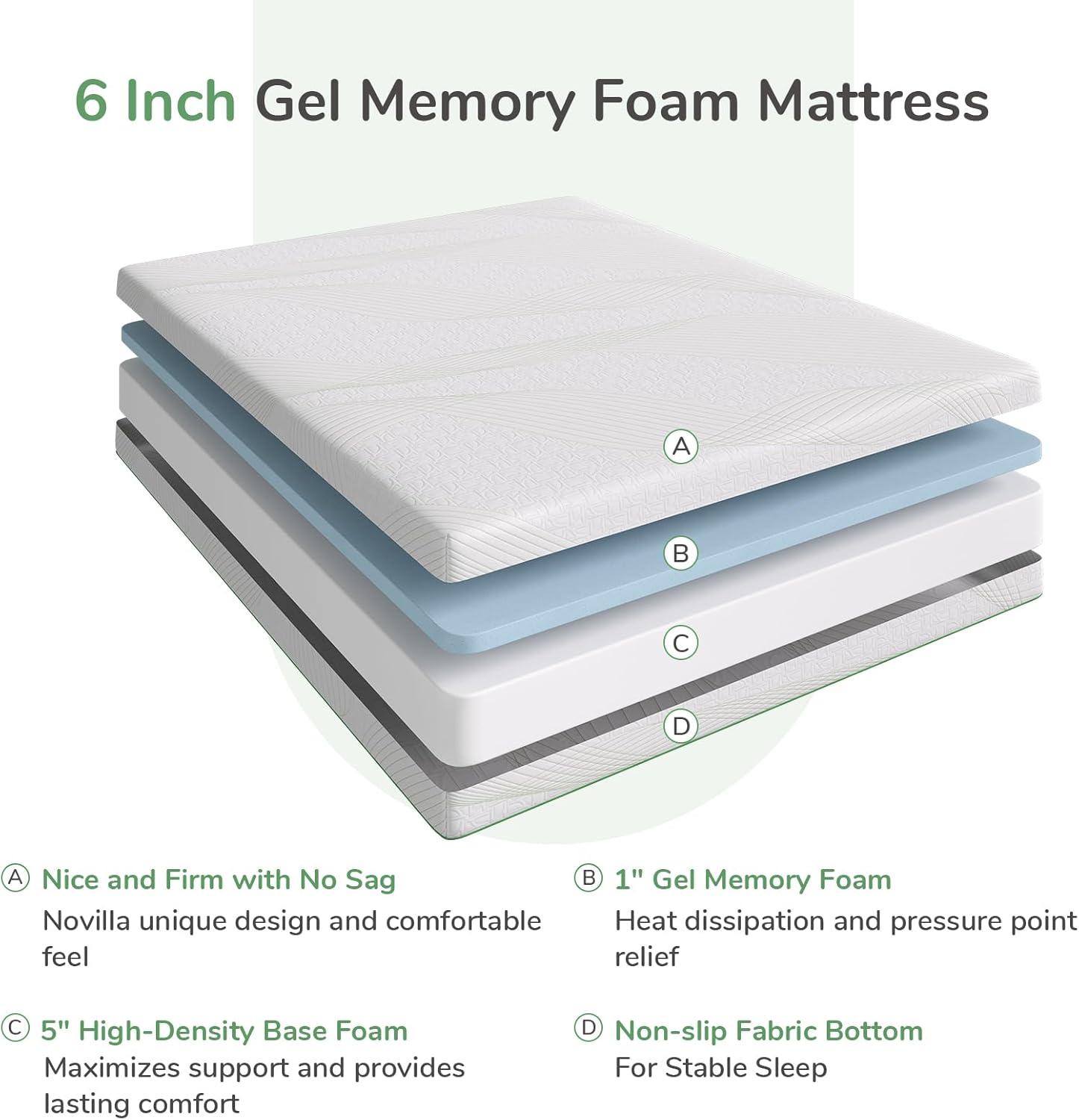GEL MEMORY FOAM MATTRESS FOR A COOLER NIGHT'S SLEEP- Gel infused in the foam can regulate the temperature of the sleep space so that you won't feel hot. Besides this, this Novilla full mattress uses soft knitted fabric for extra breathability. These materials are certified by CertiPUR-US and Oeko-Tex Standard 100 to be free of harmful substances.