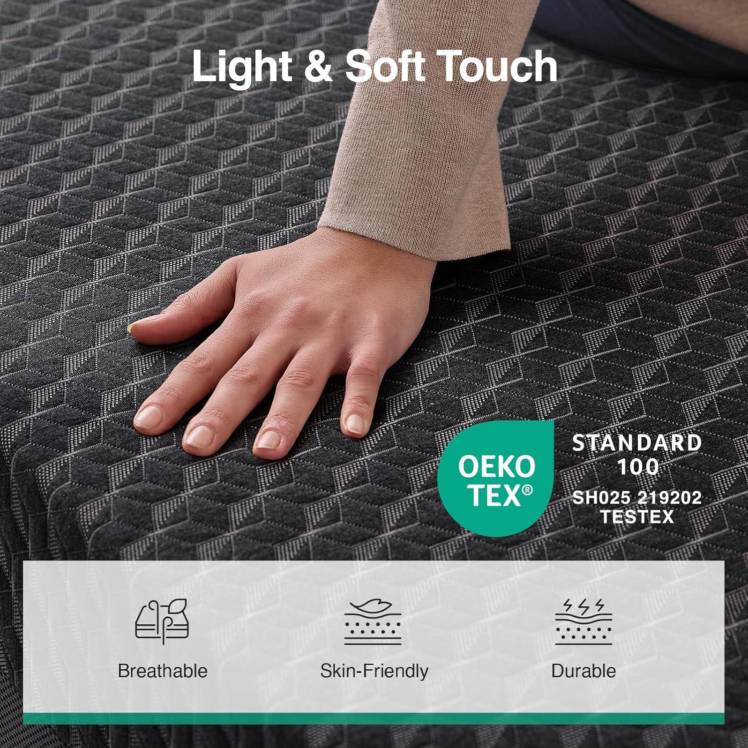 【Modern Aesthetic & Certified Safe Materials】Wrapped in a soft, skin-friendly knit fabric with a dark gray diamond pattern, this king size mattress delivers a clean, modern look with a refined, premium feel. The king mattress features an OEKO-TEX certified cover tested for harmful substances, offering added peace of mind while complementing a wide range of bedroom styles with a polished appearance.