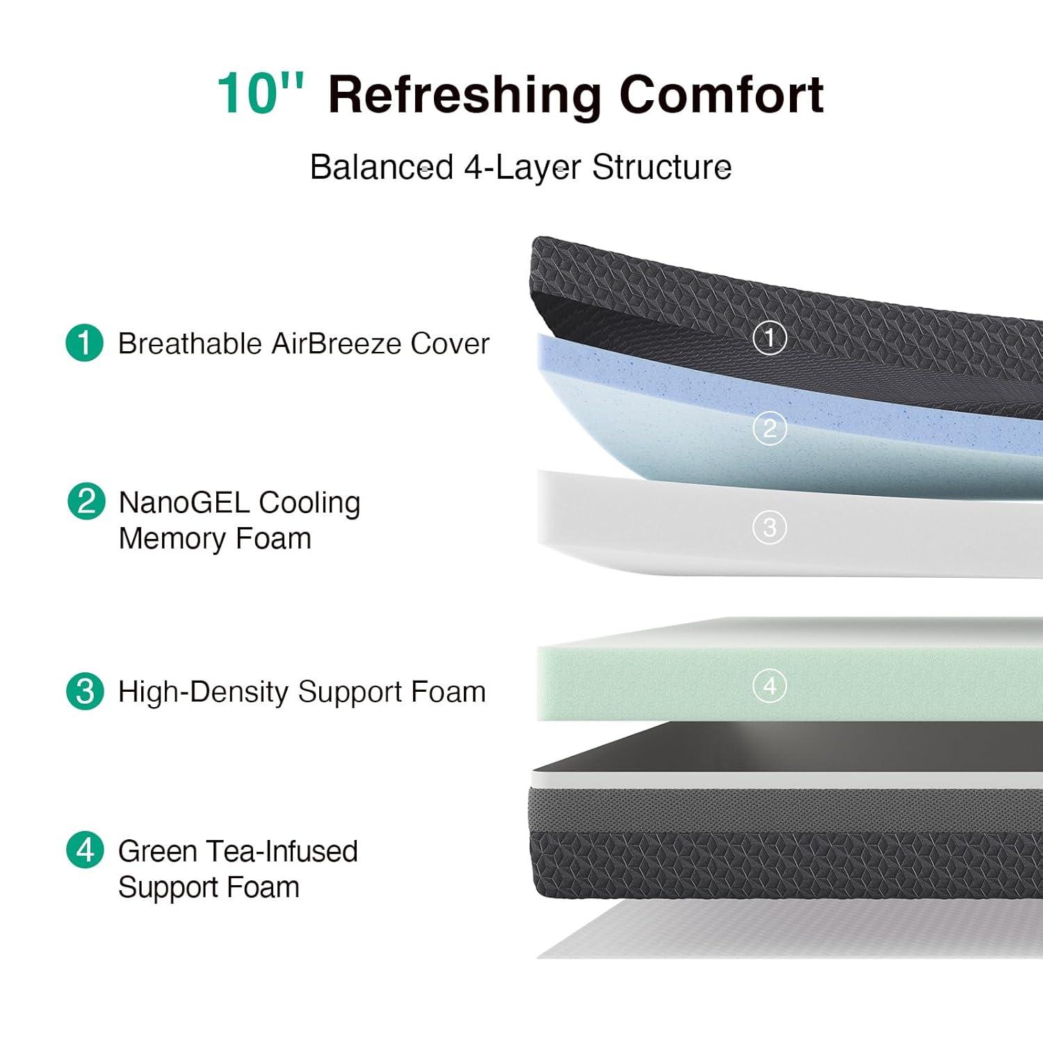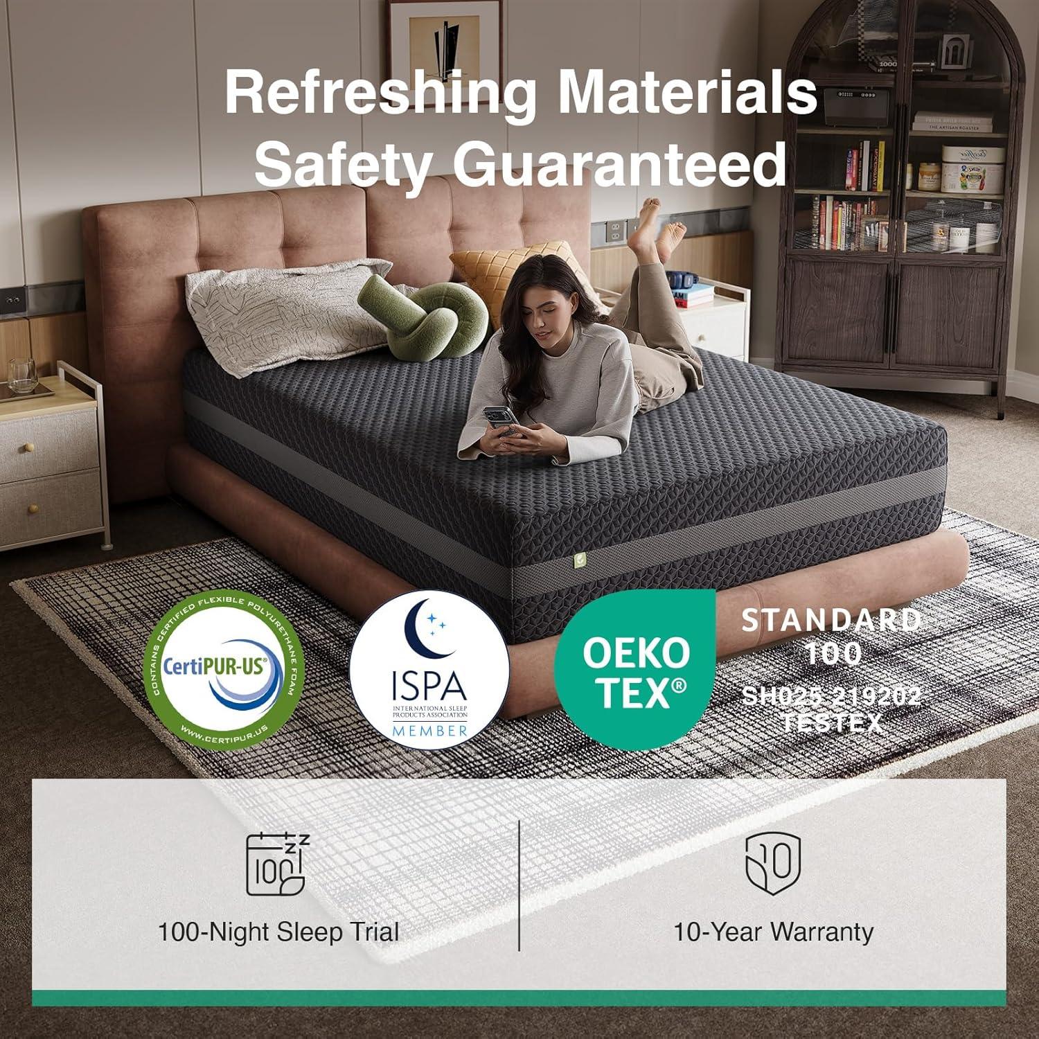 【Durable Construction & Easy Setup】Designed with a stable multi-layer foam structure, this king mattress 10 inch offers dependable durability and long-term comfort. The king mattress arrives compressed and rolled in a box for convenient delivery and setup. For best results, allow up to 72 hours for the mattress to fully expand and reach its intended shape and performance. Backed by a 10-year protection plan and a 100-night sleep trial, it offers added peace of mind for everyday use.