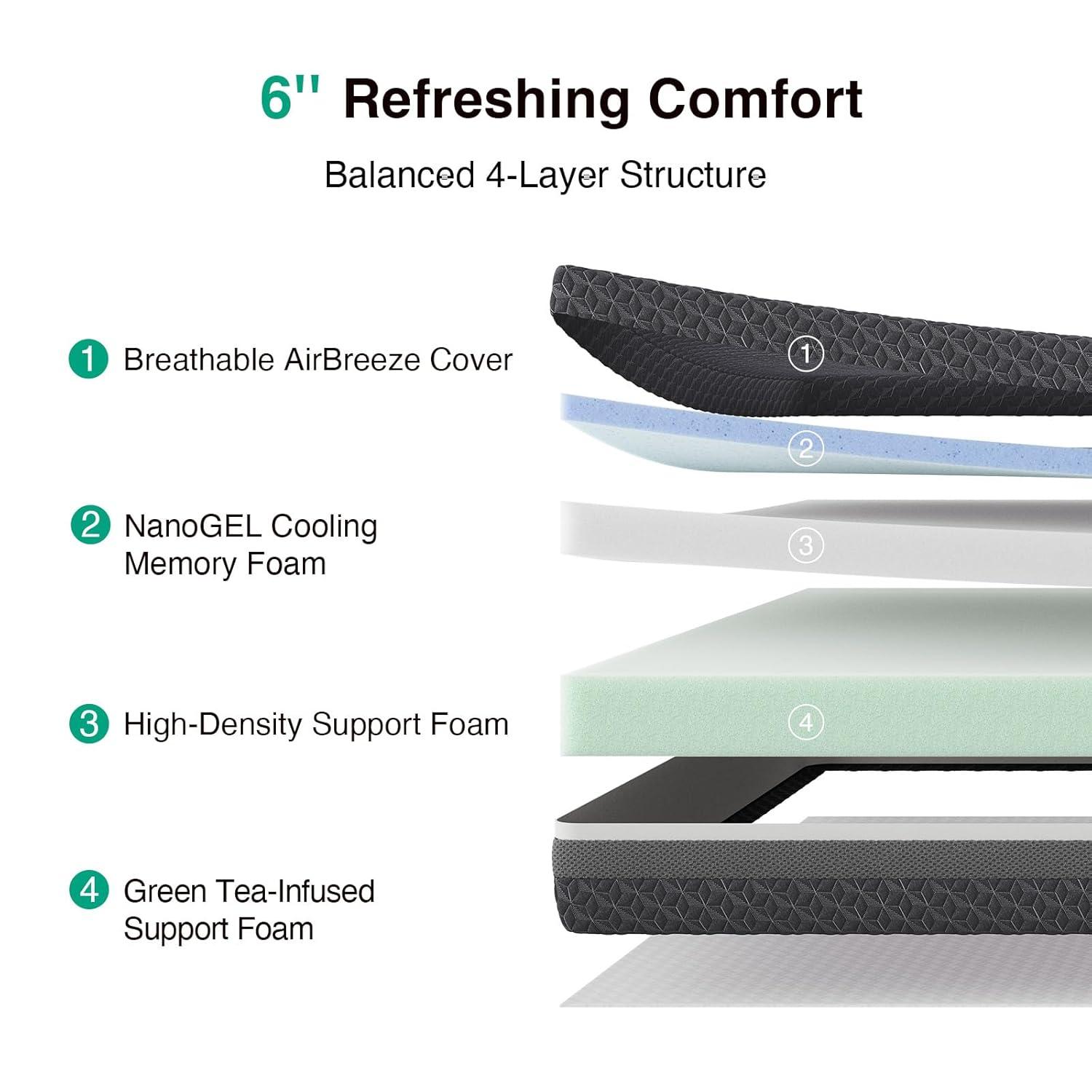 【Enhanced Breathability & Airflow Design】Built with breathable NanoGEL memory foam, a ventilated side mesh panel, and a soft knit cover, this mattress king size promotes consistent airflow to help regulate temperature. The king mattress design allows heat to dissipate more efficiently, supporting a comfortable sleep surface without excess warmth buildup.