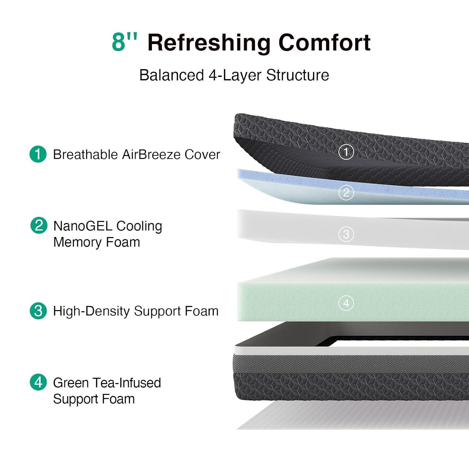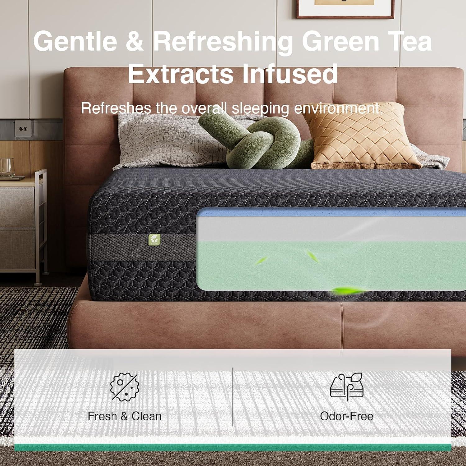 【Refined Freshness with Green Tea Foam】Featuring green tea-infused foam, this king gel memory foam mattress is designed to help manage unwanted odors and maintain a cleaner, more refined sleep environment over time. The king size memory foam mattress supports a consistently fresh feel that enhances overall sleep comfort, even with daily use.