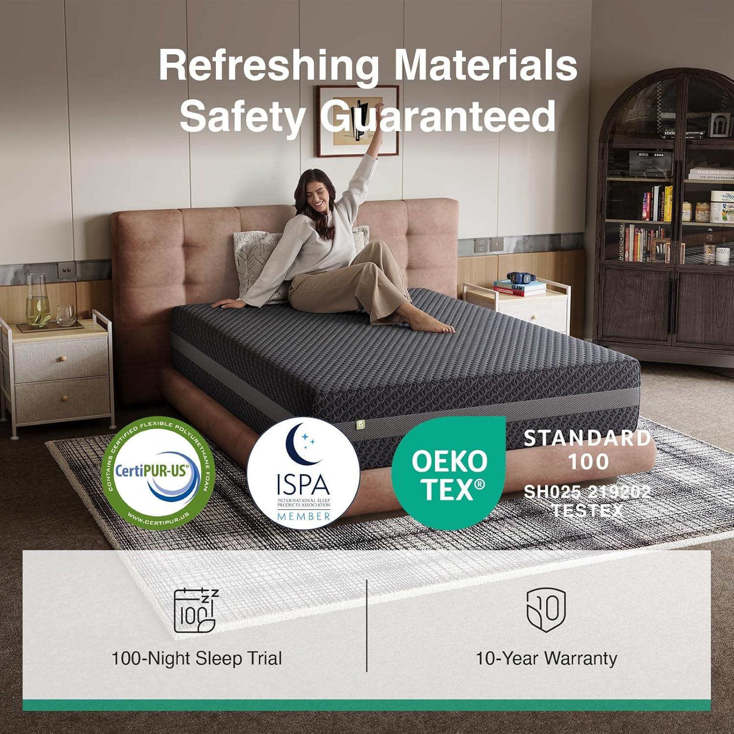 【Durable Construction & Easy Setup】Designed with a stable multi-layer foam structure, this king mattress 10 inch offers dependable durability and long-term comfort. The king mattress arrives compressed and rolled in a box for convenient delivery and setup. For best results, allow up to 72 hours for the mattress to fully expand and reach its intended shape and performance. Backed by a 10-year protection plan and a 100-night sleep trial, it offers added peace of mind for everyday use.