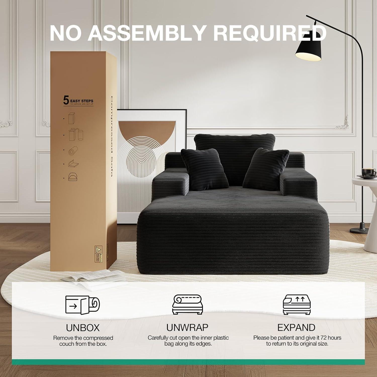 NO ASSEMBLY REQUIRED: Say goodbye to typical furniture assembly hassles! Our oversized chaise lounge arrives vacuum-sealed for compact delivery—Unpack carefully to avoid injury from sudden release. Gently pat around and wait 48-72 hours for it to fully return to its original state.