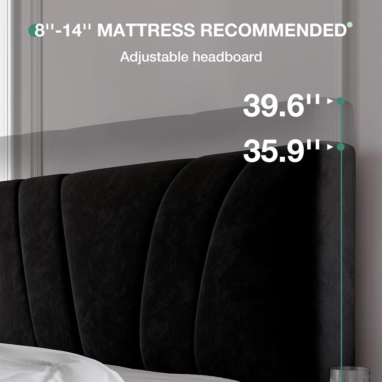 37.6 inches to 41.5 inches Adjustable Headboard: Our queen size bed frame features a headboard with adjustable height, ranging from 37.6 inches to 41.5 inches, catering to mattresses measuring 8-14 inches in thickness. This flexibility empowers you to select the ideal mattress that suits your specific requirements and preferences.