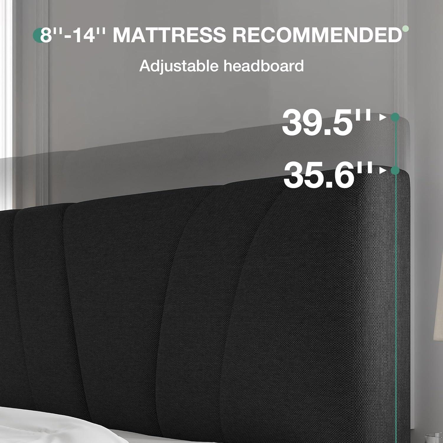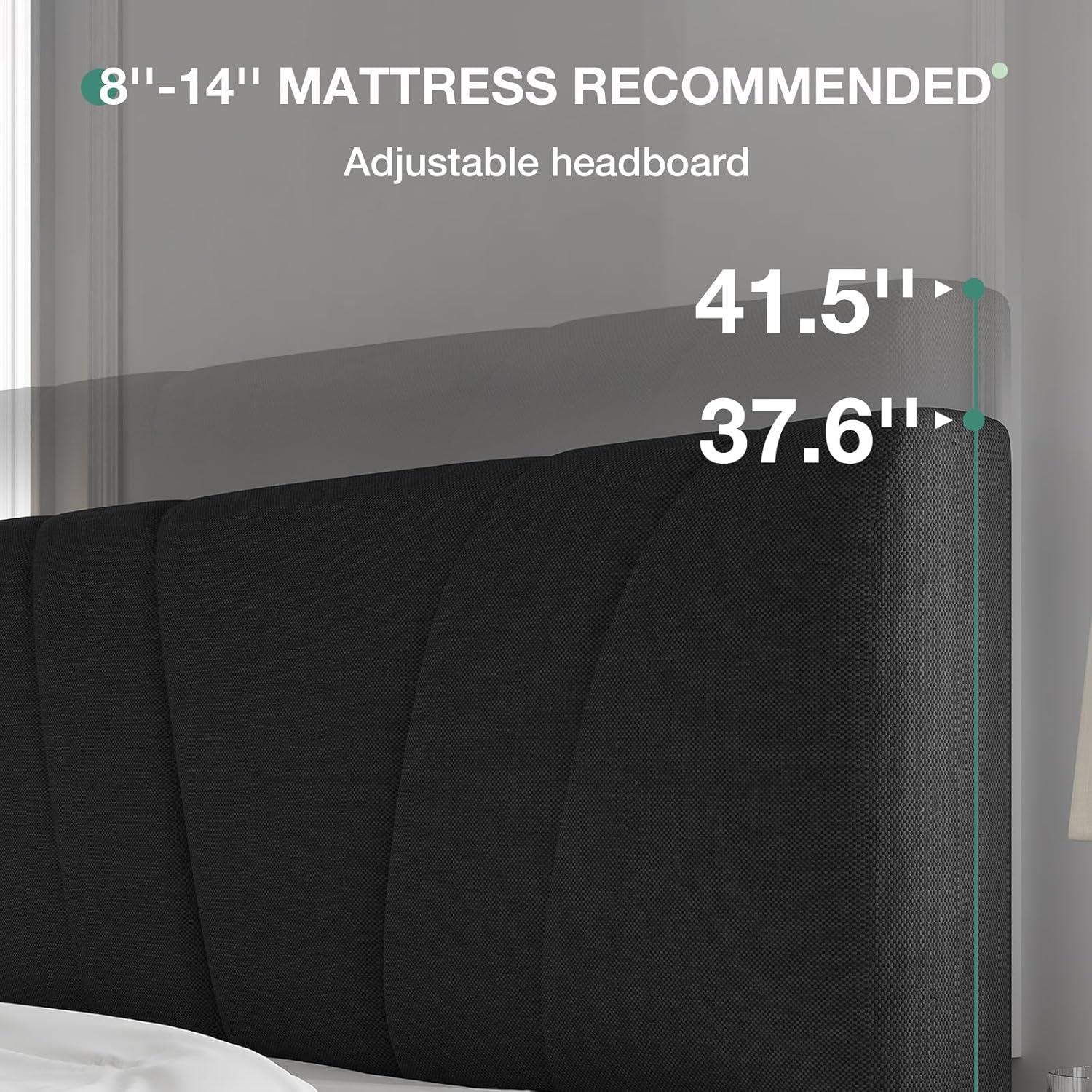 37.6 inches to 41.5 inches Adjustable Headboard: Our queen size bed frame features a headboard with adjustable height, ranging from 37.6 inches to 41.5 inches, catering to mattresses measuring 8-14 inches in thickness. This flexibility empowers you to select the ideal mattress that suits your specific requirements and preferences.
