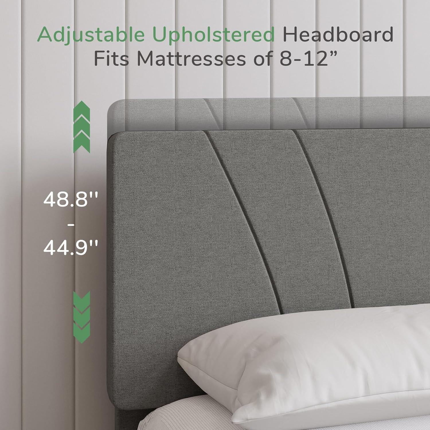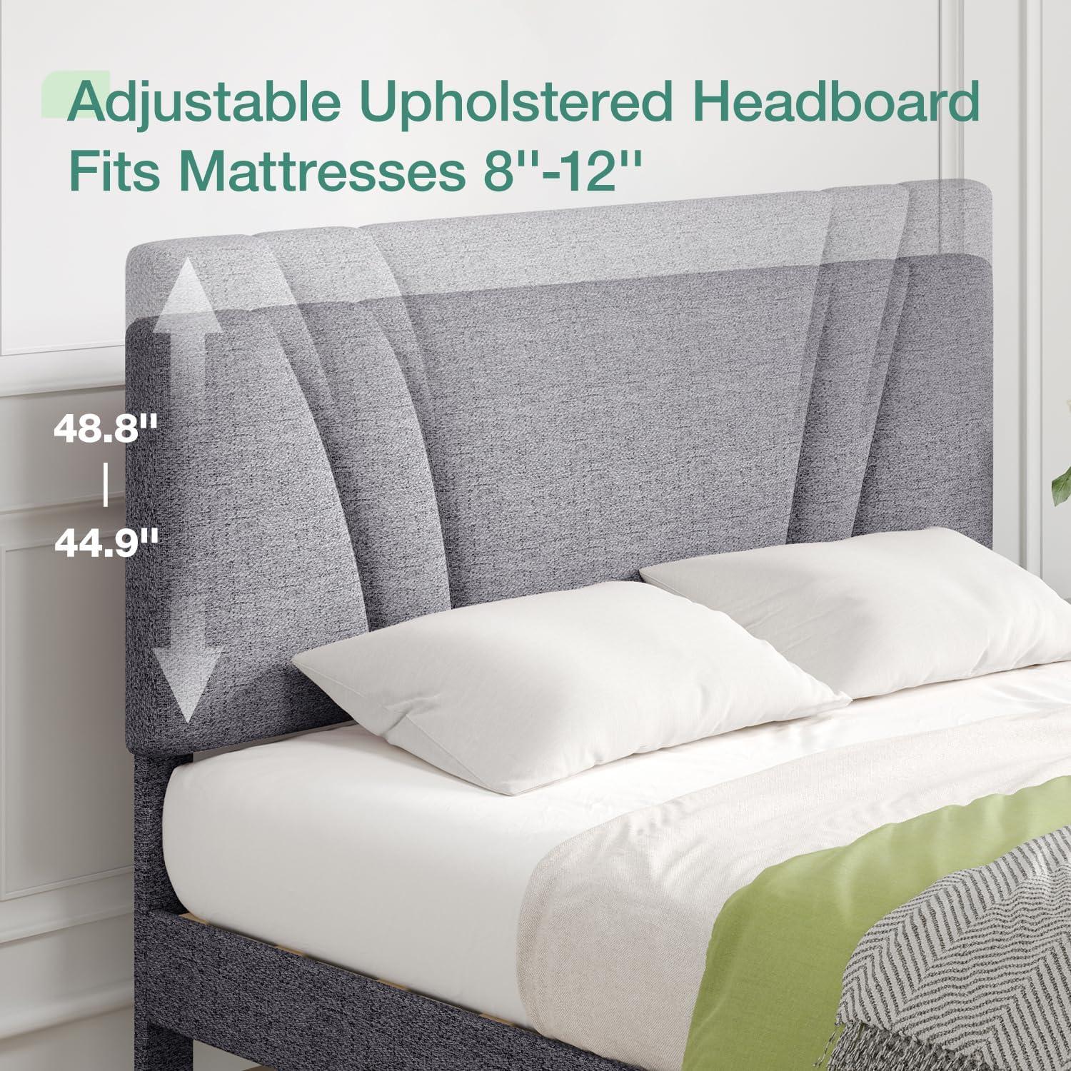 37.6 inches to 41.5 inches Adjustable Headboard: Our queen size bed frame features a headboard with adjustable height, ranging from 37.6 inches to 41.5 inches, catering to mattresses measuring 8-14 inches in thickness. This flexibility empowers you to select the ideal mattress that suits your specific requirements and preferences.