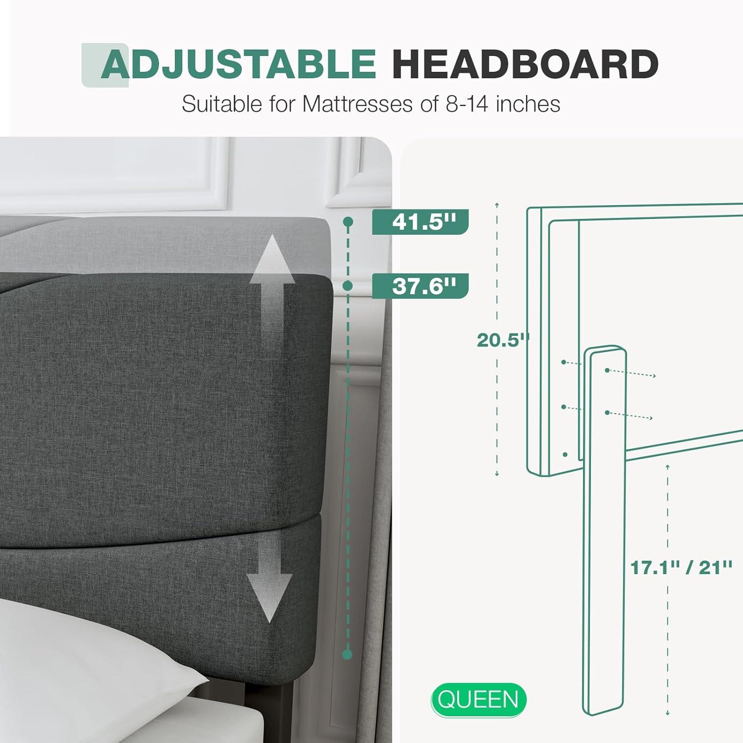 【Adjustable Headboard】The queen bed frame with headboard can be adjusted from 37.6 inches to 41.5 inches in height, suitable for mattresses from 8-14 inches. You can choose the right mattress according to your certain needs and preferences.