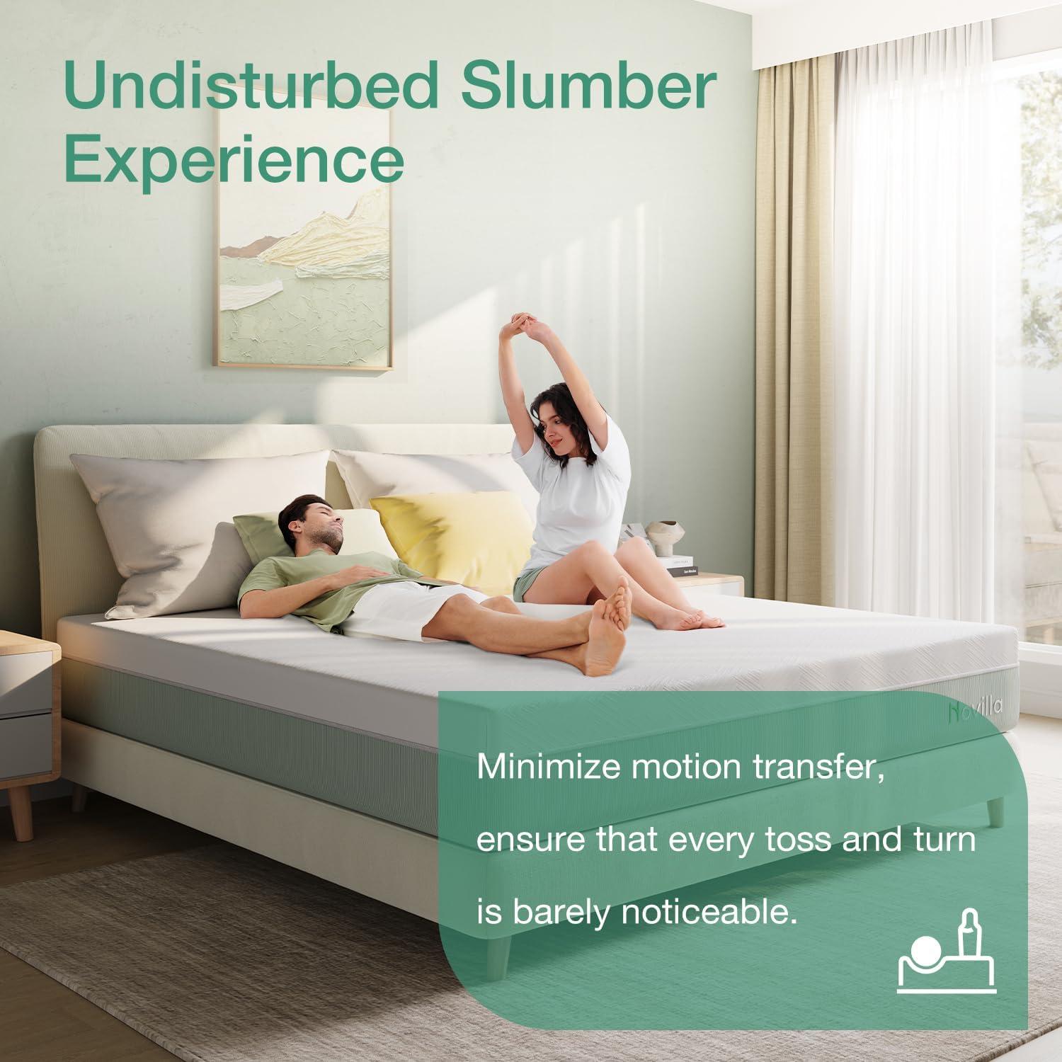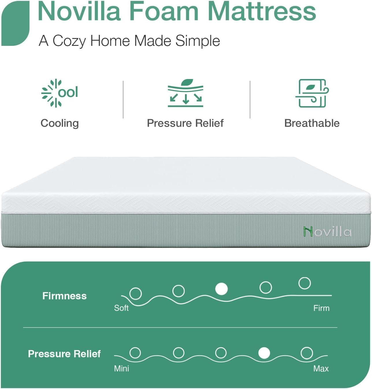 COOL and HIGHLY BREATHABLE- Novilla queen size mattress constructed with a 4-layer all-foam system. On top is a gel-infused memory foam that keeps you cool. The egg crate designed foam layer increases airflow through all areas of this queen memory foam mattress.The mattress cover can also increase breathability by 30%. Ensures you stay asleep longer with this bed mattress.