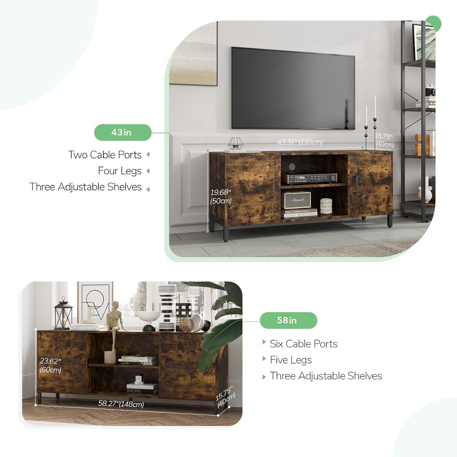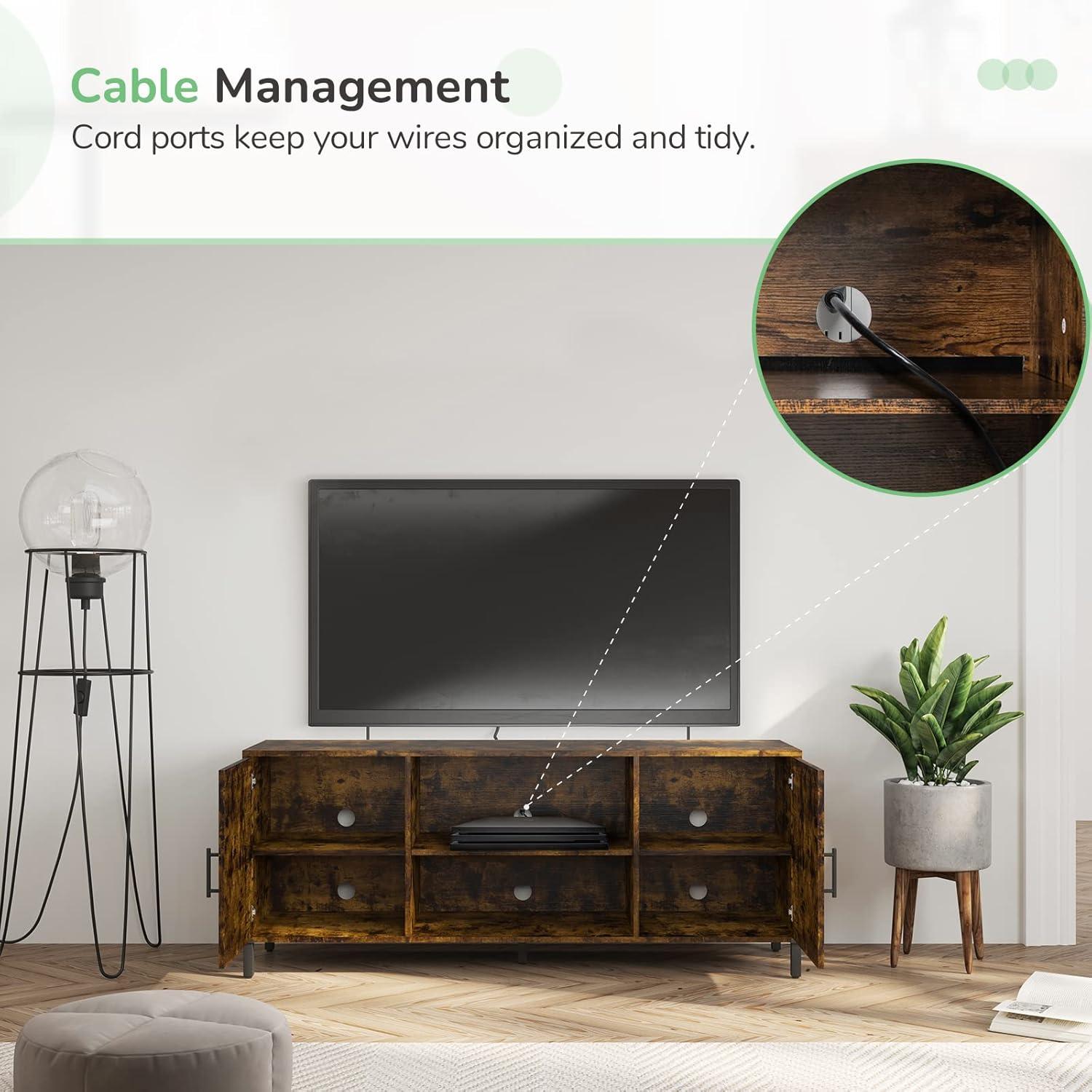LARGE STORAGE SPACE: Three adjustable shelves hold your electronics and media accessories. Two enclosed cabinets provide enough room to stow away extras for a neat and organized space. Two cord management ports keep cables tidy.