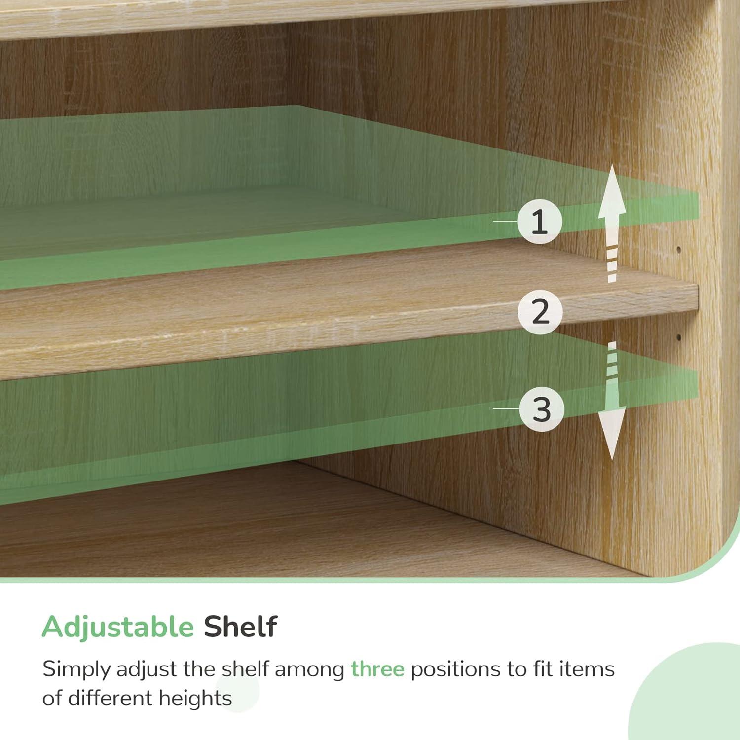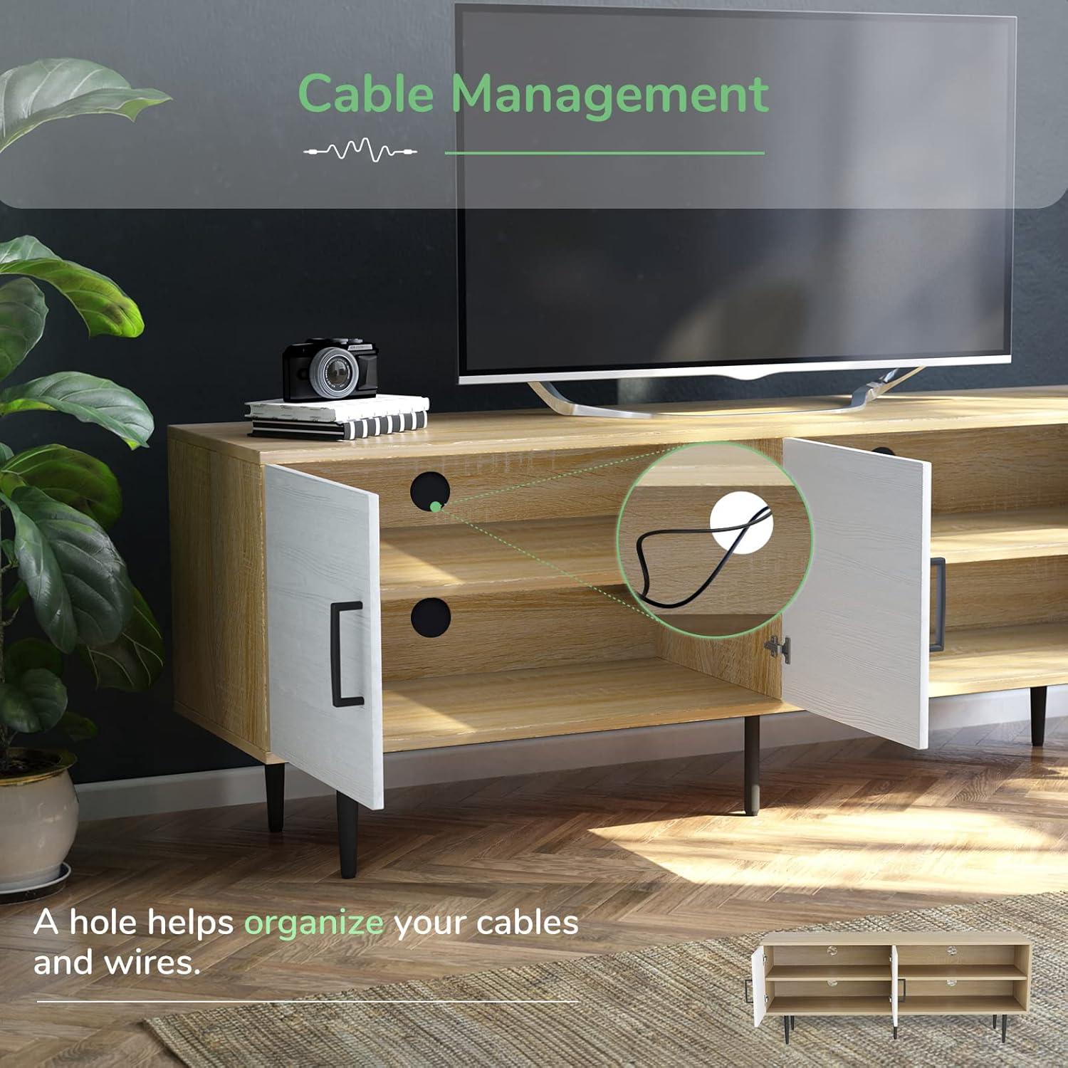 LARGE STORAGE SPACE: Three adjustable shelves hold your electronics and media accessories. Two enclosed cabinets provide enough room to stow away extras for a neat and organized space. Two cord management ports keep cables tidy.