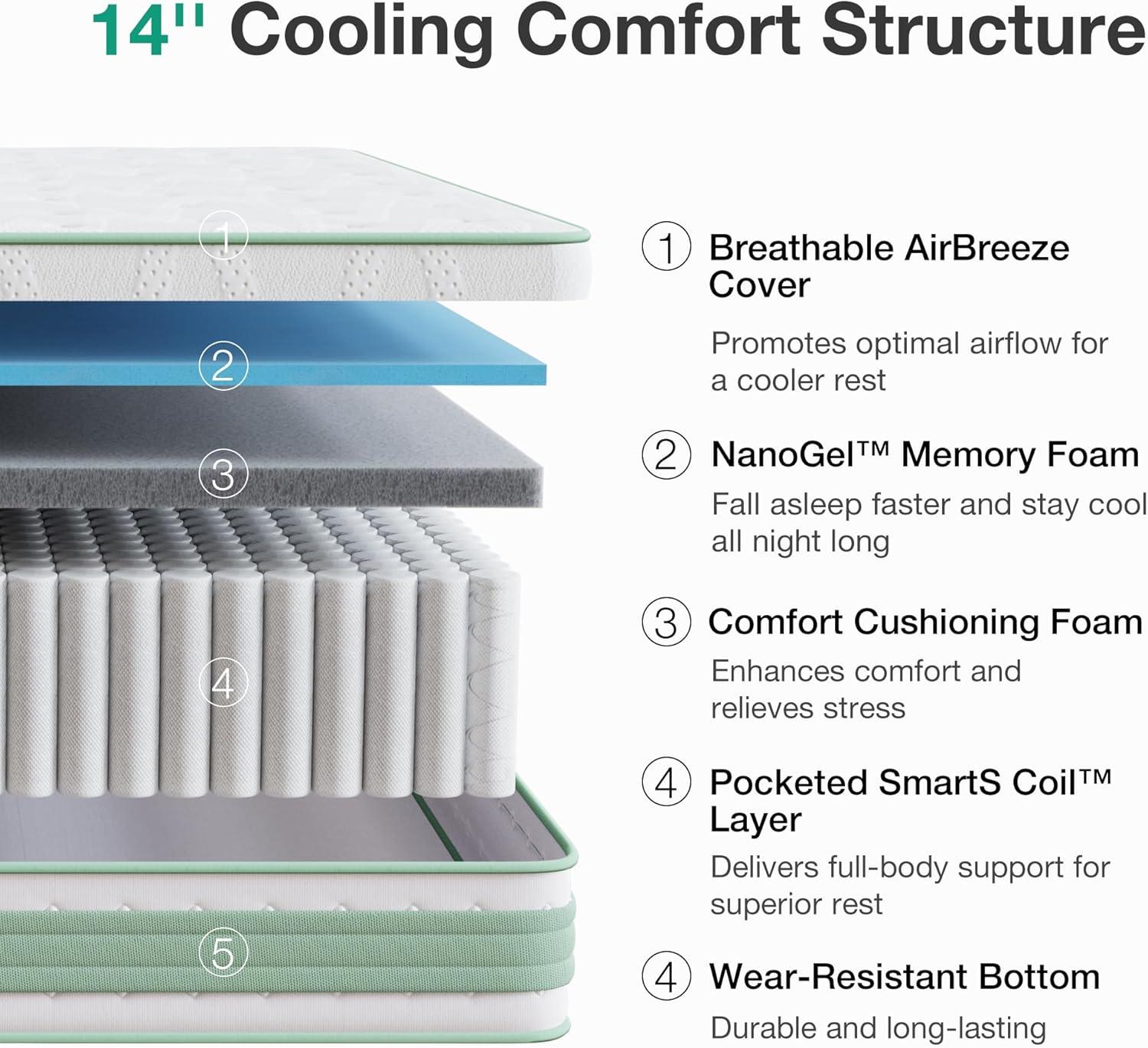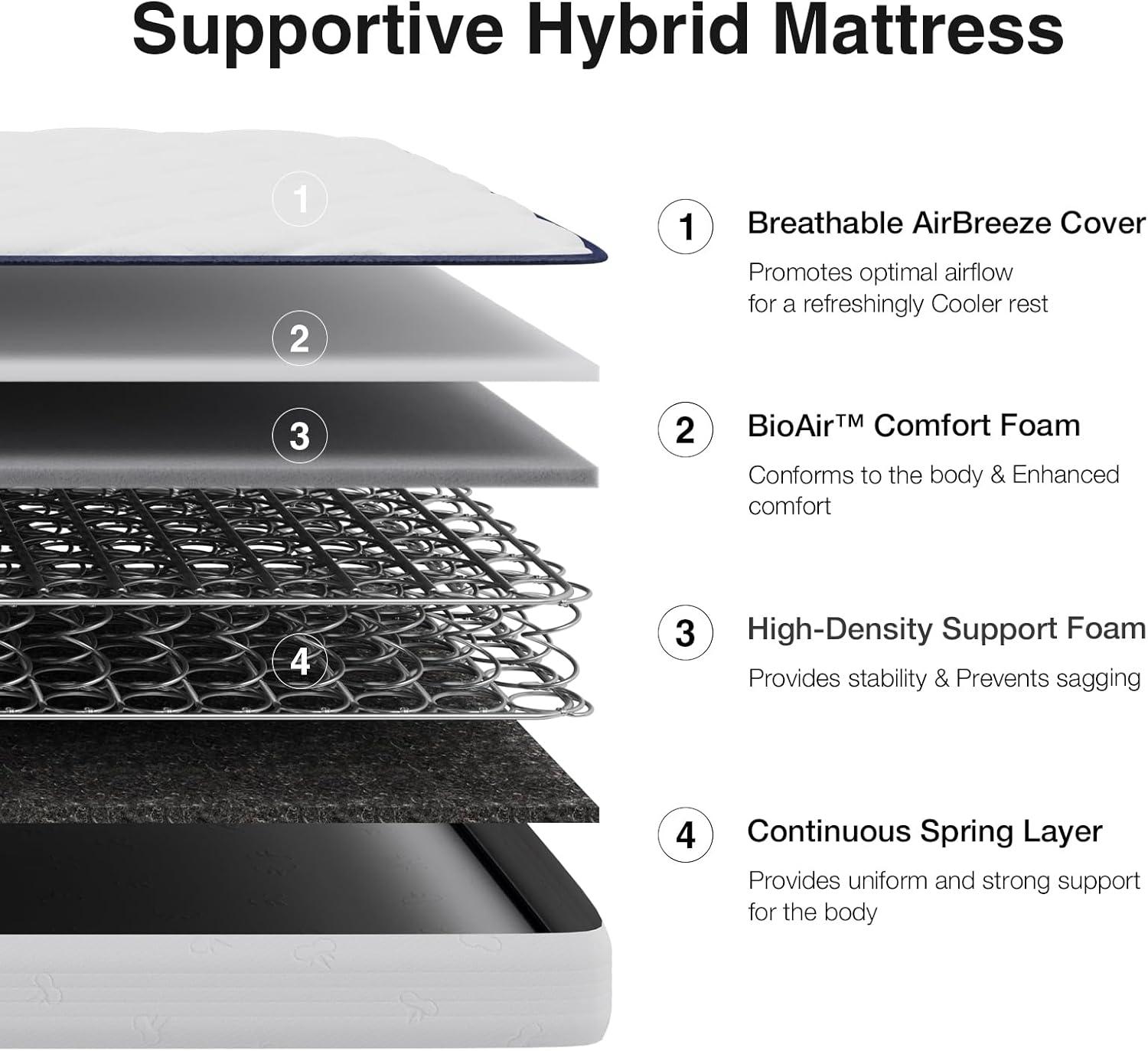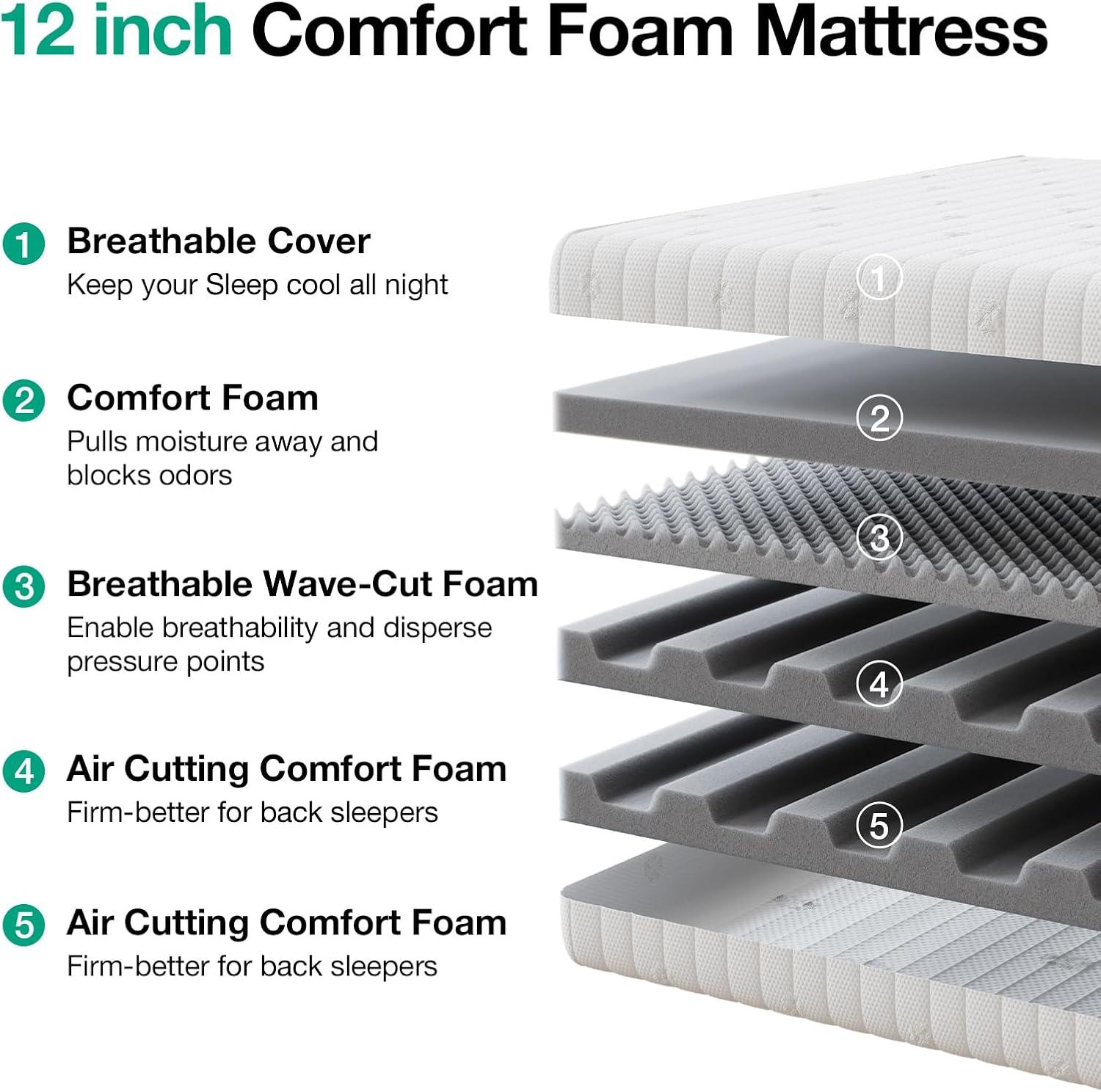 GEL MEMORY FOAM ENHANCED COZY FEATURE – The five-layer hybrid mattress, equipped with gel memory foam & high-density foam stabilizes your sleep temperature. It controls temperature accumulation that disrupts a comfortable night's sleep and is further optimized for temperature control, heat dissipation and pressure relief. The comfortable gel memory-foam layers guarantee a COZY feeling at night while you sleep.